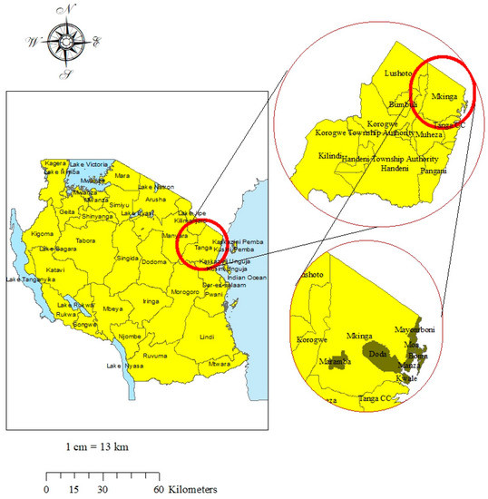 Map of the study site. Left is the map of Tanzania located in the Eastern part of Africa. The top-right figure shows the map of Tanga region, where the Mkinga district is located. The bottom-right figure shows the map of wards in the Mkinga district, whereby villages in these wards participated in this study. The study site map was originally generated using ArcGIS software version 10.7.1 [28].