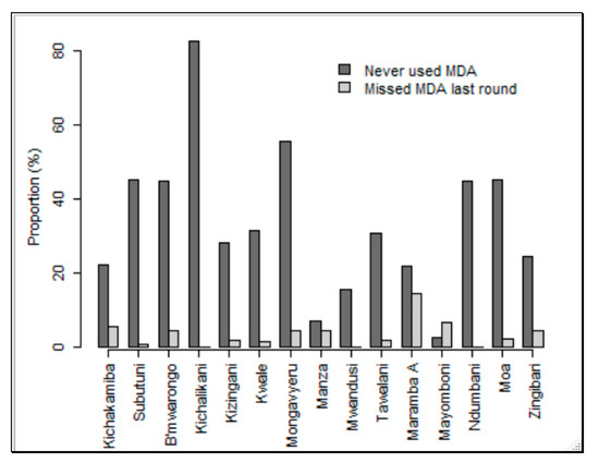 - Kisoka, W.J.; Tersbol, B.P.; Meyrowitsch, D.W.; Simonsen, P.E.; Mushi, D.L. Community Members’ Perceptions of Mass Drug Administration for Control of Lymphatic Filariasis in Rural and Urban Tanzania. J. Biosoc. Sci. 2016, 48, 94–112. [Google Scholar] [CrossRef] [PubMed]