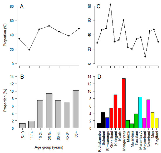 Proportion of individuals who did not use MDA in the last round of distribution by age group (A) and by villages (C); and prevalence of CFA by age group (B) and by village of residence (D). The color bands represent Boma, Doda, Kwale, Manza, Maramba, and Mayomboni wards.