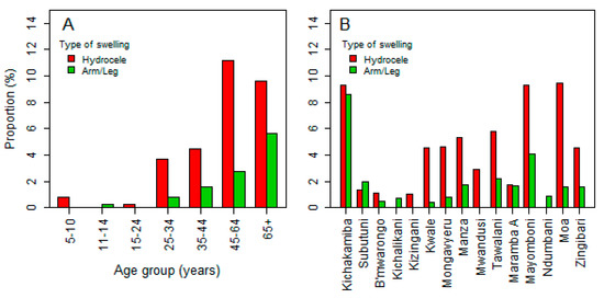 Distribution of hydrocele in males and swelling of arms or legs in both males and females by age group (A) and by village (B).