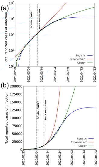 4]). The cubic polynomial fit and the exponential one present in the figure both use data referred to 18 days starting on the date of acknowledgement of the first cases (from 24 February to 12 March 2020); starting from that date, the cubic fit, according to AIC test, scores better than the exponential one. In the figure, we also show the fit obtained from a logistic function for comparison; logistic fit scores become better than the exponential one from 12 March 2020 and better than the cubic one after 25 March 2020.