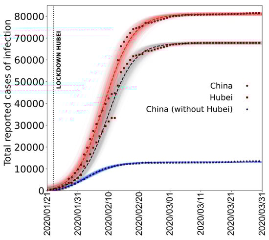 Figure 2, we show the fit made using a logistic function, to the epidemic curve of the cumulative daily number of cases (infections) reported in the whole China, Hubei province and China without the Hubei province [
