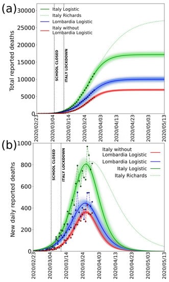 Figure 4a,b shows in red the logistic fit (and its derivative) to the cumulative (and the new) number of deaths in Emila Romagna.