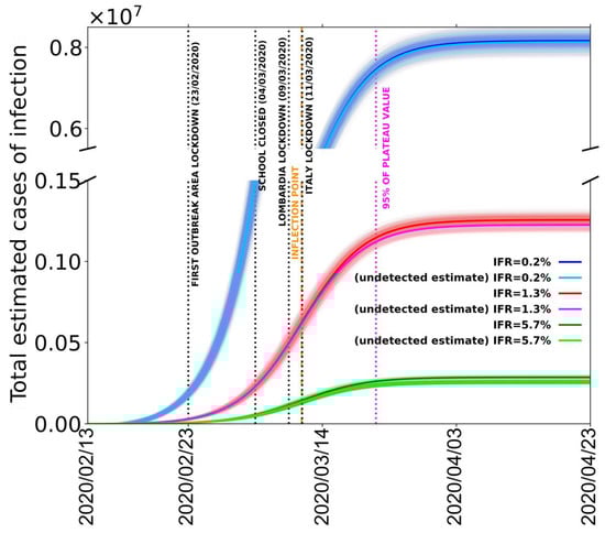 2], is based on the minimum reliable CFR values and assuming a 50% rate of non-recorded infections; the second one uses the unusual laboratory-like case study provided by the Diamond Princess cruise ship on which all passengers and crew (3771 people) were tested for SARS-CoV-2; a third one using the CFR computed by Italian authorities and assuming, as in the first case, that the detections have lost almost all asymptomatic and pauci-symptomatic individuals. University of Oxford computed a value of IFR = 0.2%. In the second approach, we considered that, on the Diamond Princess cruise ship, 712 infections were detected and 9 of them died. This permits a mostly unbiased value of IFR = 1.3% to be calculated. In the third case, from a CFR = 11.3%, we computed an IFR = 5.7%. We then consider these values as the limits defining the range of IFR. If we assume that the infection number underestimation is the only reason for the large overestimation of the lethality rate, to determine the real number of infected cases and correct the apparent lethality to the true value, we should multiply the “official” number of recorded infections by the ratio between the CFR = 11.3% and the IFR (=0.2%, 1.3%, or 5.7%). In this way, we obtain a real number of infections in Italy (as of 30 March 2020) that ranges between about 0.3 and 8 million people infected (