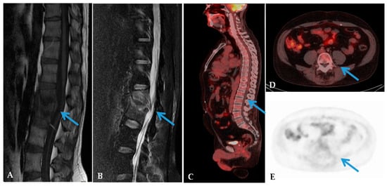 MRI and 18F-FDG PET/CT in a 55-year-old man with back pain, fever, and with positive microbiology culture (Staphilococcus aureus). Sagittal MRI images showed in T1-Weighted (A) and Short Time Inversion Recovery (B) sequences pathological signal in the L4-L5 intervertebral disc and bone marrow edema (arrows). 18F-FDG PET/CT images (C–E) showed pathological uptake in L4–L5 (Standardized Uptake Value 6.7) (arrows). The final diagnosis of spondylodiscitis was confirmed.