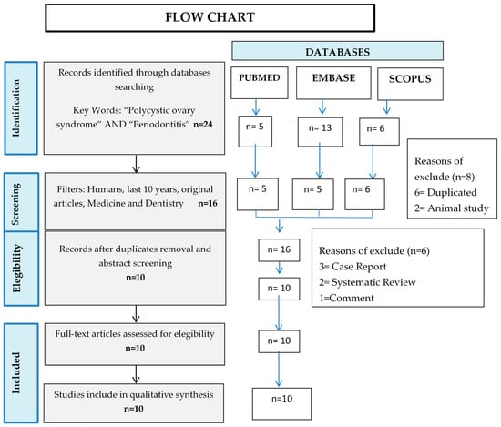 The following exclusion criteria were established: full text not available, letters to the editor, and case reports and bibliographic reviews. Once the articles had been identified, we screened them by reading the abstracts and excluding the articles whose content did not involve periodontal disease and its relationship with PCOS. Duplicated articles were also eliminated. In this way, we were left only with the articles that met the criteria to answer the PICO question (Figure 1).