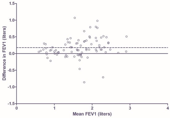 In children with CF, the FEV1 was significantly lower in the home measurements compared to hospital measurements (mean difference 0.18 L; 95% CI 0.08–0.27 L; p < 0.001). The Bland-Altman plot (Figure 1) showed the degree of agreement between the two methods. Difference in FEV1 was calculated by subtracting the home FEV1 measurement from the clinical FEV1 measurement. In this figure a total of 86 paired measurements are shown. As described in Section 2, these are not all of different participants because multiple paired measurements of an individual participant could be collected at various time points. In the 36 children with CF, 25 children (69%) had multiple measurements at different time points. Seventy of the 86 paired measurements (81%) had a difference of 0.05 L or more. Fifty-seven (66%) had a difference of 0.10 L or more and 43 of the 86 measurements (50%) had a difference of 0.15 L or more. There was no significant learning effect (overall p = 0.406), but the difference in FEV1 increased significantly with age (mean increase = 0.04 L/year, 95% CI 0.01–0.07, p = 0.011).