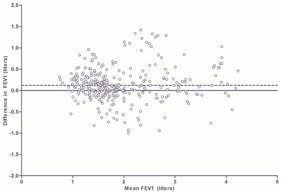 Bland-Altman plot showing degree of agreement between the two types of measurement in patients with asthma. Difference in FEV1 is calculated by subtracting home FEV1 measurement from clinical FEV1 measurement. The dotted line shows the mean difference (0.12 L).