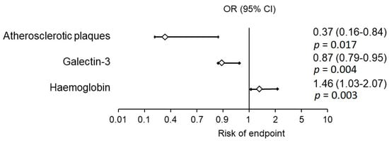 The follow-up analysis revealed a significant decrease in Gal-3 concentration in patients with atheroslerotic lesions in the carotid arteries (14.7 ± 7.2 ng/mL vs. 9.9 ± 2.1 ng/mL, p = 0.02). This relationship was not observed in the group of patients without carotid atherosclerosis.