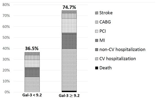The frequency of adverse events due to galectin-3 concentration. CABG—coronary artery bypass grafting, CV—cardiovascular, Gal-3—galectin-3, MI—myocardial infarction, PCI—percutaneous coronary interventions.