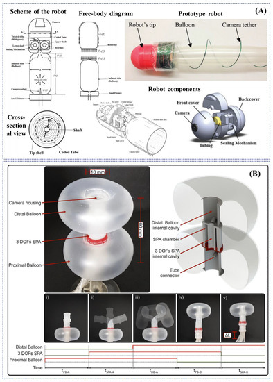 Examples of research-oriented innovative robotic colonoscopes and devices with pneumatic actuation: (A) self-steering pneumatically driven colonoscopy robot developed by Dehghani et al. [101]; (B) soft pneumatic inchworm double balloon (SPID) colonoscope developed by Manfredi et al. [102].