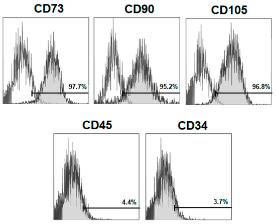 To verify the mesenchymal immunophenotype, BM-MSCs were characterized by flow cytometry. Cells expressed levels of specific MSC-surface markers, such as CD73, CD90 and CD105 and lacked the expression of the non-specific markers of MSCs (hematopoietic): CD34 and CD45 (Figure 1).