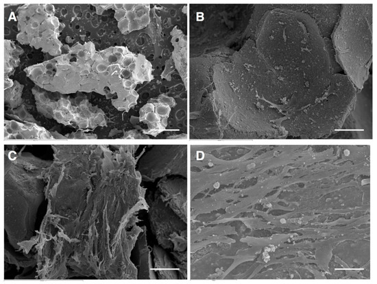BM-MSCs adhesion and growth on β-TCP granules was performed by scanning electron microscopy (SEM) micrographs. After 24 h, few BM-MSCs were detected adhered to β-TCP granules. Importantly, at 7 days, it was observed that cell density was increased and covered the biomaterial, exhibiting multiple extensions that anchored the cells to the β-TCP granules. After 14 days of culture, multilayered cultures of BM-MSCs adhered to the biomaterial, were evidenced. Furthermore, irregular-shaped particles and numerous extracellular matrix components and were observed on the surface of the cells (Figure 2).