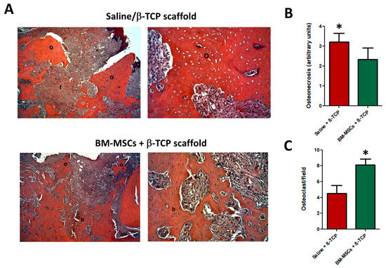 Representative images of HE staining of maxillary bone after induction of osteonecrosis in control animals transplanted only with saline + β-TCP scaffold, (A, top images) and those treated with BM-MSCs + β-TCP scaffold (A, bottom images) 4 weeks after treatment. Left images magnification: × 100; Right images magnification: ×400; (B) control animals displayed a higher degree of osteonecrosis than BM-MSC-treated counterparts (* p < 0.05) whereas osteoclast number per high-power field at 400× was significantly augmented in (C) the BM-MSC-treated group (* p < 0.05). Symbols: o: osteonecrotic areas; f: fibrotic areas; b: bone neoformation.