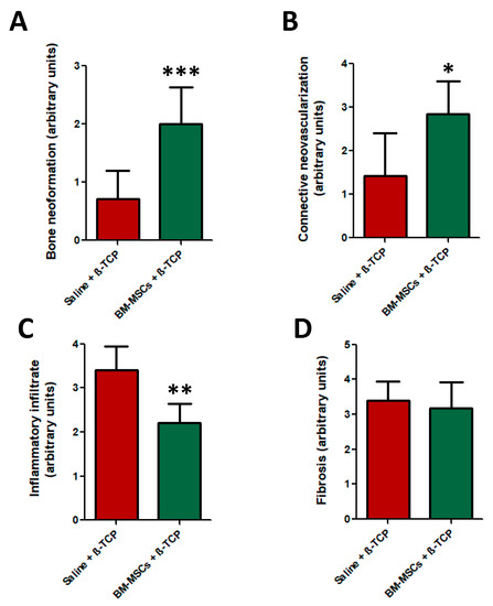 Evaluation of the effect of BM-MSC mediated bone neoformation, connective tissue neovascularization, inflammatory infiltrate and degree of fibrosis. (A) Maxillary bone of BM-MSC + β-TCP-treated animals showed a significant degree of bone neoformation; (B) connective tissue neovascularization and (C) significant lower inflammatory infiltrate, * p < 0.05, ** p < 0.01 and *** p < 0.001, respectively; (D) however, the degree of fibrosis was not significantly different between both experimental groups.