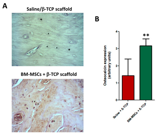 Representative images of immunohistochemical expression of osteocalcin of maxillary bone after induction of osteonecrosis in control animals transplanted only with saline + β-TCP scaffold, (A, top image) and those treated with BM-MSCs + β-TCP scaffold (A, bottom image) 4 weeks after treatment. While in control animals the empty lacunae (+) and osteocytes (*) are negative, osteocytes from BM-MSC-treated bone strongly expressed osteocalcin (<). ABC immunohistochemical procedure anti-osteocalcin were performed. Magnification: ×400; (B) number of osteocalcin positive cells were significantly more abundant, ** p < 0.01.