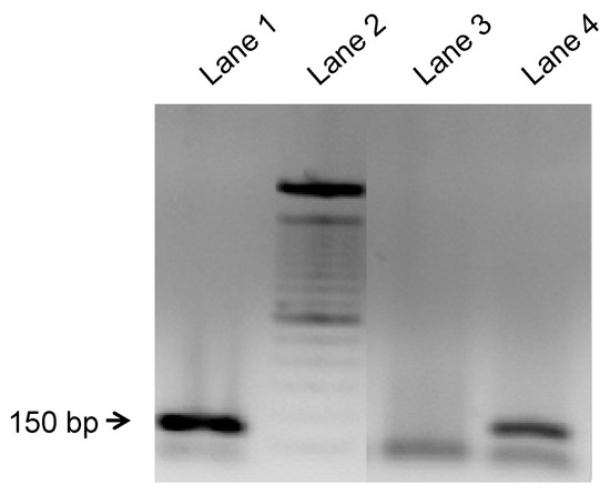 Representative analysis of nested polymerase chain reaction (PCR) for defining the presence of transplanted male rat BM-MSCs in the female recipient maxillary using the sex-determining region of the Y chromosome as a quantification marker. PCR amplification products were 150 bp. Lane 1: positive control (liver cells from male rats); Lane 2: 100 bp DNA ladder; Lane 3: maxillary cells from female rats transplanted with saline + β-TCP scaffold; Lane 4: maxillary cells from female rats transplanted with BM-MSCs + β-TCP scaffold.