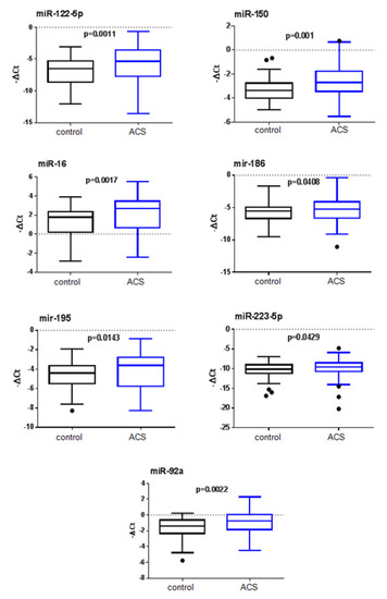 | ACS (n = 80) Mean −ΔCt | SD | Controls (n = 80) Mean −ΔCt | SD | Fold Change | p Value | |