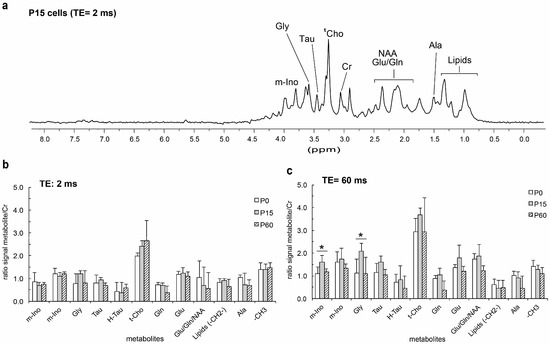 Representative 1H HR-MAS NMR spectra of intact Oligodendrocyte Precursor Cells (OPCs) with water suppression illustrating the chemical shift assignment of selected metabolites corresponding to a sample of OPCs (P15) and with a TE of 2 ms (a), and the intensities of main metabolites normalized with respect to creatine for TE of 2 ms (b) and 60 ms (c). An increase in the relative intensities of P15 metabolites with respect to those of P0 and P60 for the higher TE of 60 ms is observed, suggesting a decrease in cytoplasm viscosity. Error bars represent s.e.m. for n = 4. For all experimental groups the results were analyzed using One-Way ANOVA: * P < 0.05.