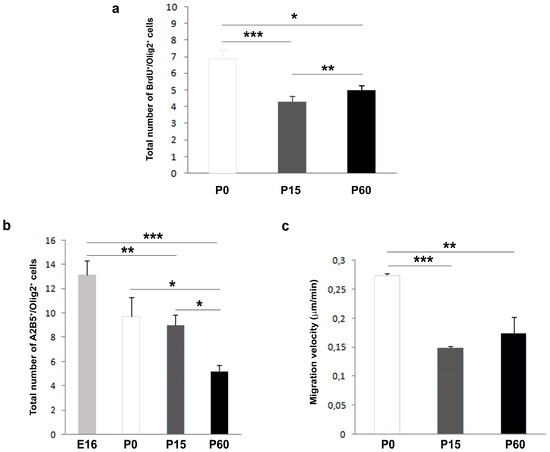 OPC proliferation and migration rates differ with age. (a) Proliferation rate of neonatal, postnatal and adult Oligodendrocyte Precursor Cells (OPCs). The number of proliferating OPCs also decreases with age. (b) Transmigrated cells of different ages after 20 h in control conditions: E16, P0, P15, and P60. The number of transmigrated cells decreases with age. (c) Histogram represents the migration speed at P0, P15, and P60. The migration speed is higher at P0, and it diminishes in OPCs from P15 and P60 mice. For all experimental groups, the results were analyzed using ANOVA and a Student´s t-test: * P < 0.05, ** P < 0.01, and *** P < 0.001.