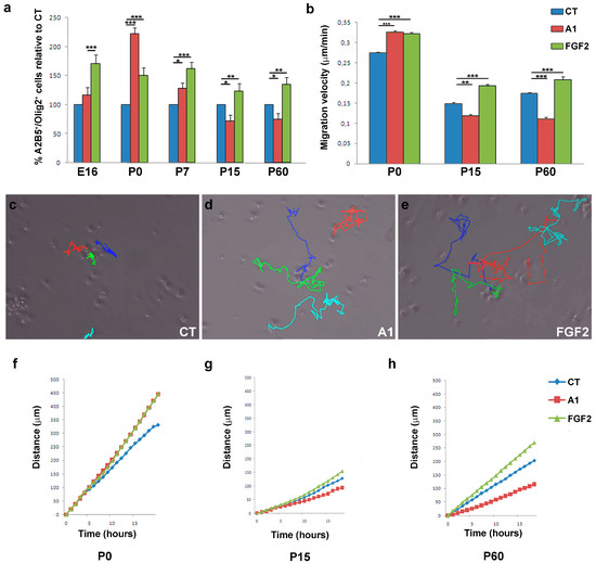 For a detailed study of OPC migration, time-lapse video-microscopy (Leica, DMI 6000B) was performed to observe the behavior of the cortical OPCs. Purified OPCs were placed on poly-l-lysine and laminin coated coverslips (10,000 cells/coverslip; Sigma-Aldrich, San Luis, AZ, USA) and FGF2 (20 ng/mL; R&D Systems, Minneapolis, MN, USA) or CT CHO or A1-expressing CHO cell extracts (0.1 mg/mL, see above) were added in BS medium. Images were taken every 20 min for 18 h and the speed of cell motility was assessed with the manual tracking plugin of the ImageJ software. The values represent the ratio of the number of stops (times distance measured was equal to 0) over the number of cells.
