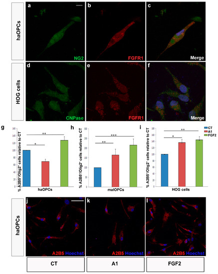 Effect of FGF2 and anosmin-1 on human Oligodendrocyte Precursor Cells (OPCs) migration. Adult human OPCs (haOPCs; (a–c) and Human OligodendroGlioma (HOG) cells (d–f) expressed FGFR1. In both types of tumor cell analyzed, malOPCs (h) and HOG cells (i), the response to FGF2 and anosmin-1 was the same. haOPCs responded to FGF2 like malOPCs, while the response to anosmn-1 is the opposite in these cell types (g). (j–l) Images of malOPCs in chemotaxis chambers stained with A2B5 (red). Scale bar represents 7.5 µm for a–f and 25 µm for j–l. The results obtained with Student´s t-test are represented as: * P < 0.05, ** P < 0.01, and *** P < 0.001.