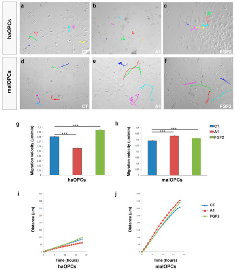 Video time-lapse imaging of human Oligodendrocyte Precursor Cells (OPCs) migration. (a–f) The manual tracking of haOPCs (a–c) and malOPCs (d–f). haOPCs migrate faster in the presence of FGF2 (g), while anosmin-1 (A1) has the opposite effect. malOPCs show the contrary pattern with a higher migration velocity for A1-treated cells and lower for FGF2-treated cells (h). Distance plots are represented in (i) and (j). Each colour in a-f represent the tracked path of one cell. The results of migration velocity with a Student´s t-test are represented as: *** P < 0.001.