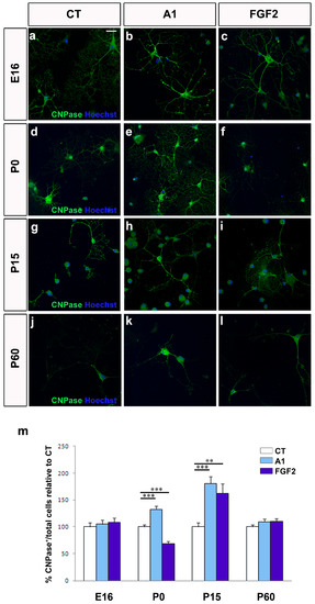 Purified OPCs were placed on coverslips coated with poly-l-lysine and laminin (20,000 cells/coverslip), and FGF2 (20 ng/mL; R&D Systems, Minneapolis, MN, USA) or total protein from CT CHO cells or A1-expressing CHO cells (0.1 mg/mL, see above) were added in differentiation medium (BME:F12 media (Gibco | Thermo Fisher Scientific, Waltham, MA USA) [1:1] supplemented with 100 μg/mL transferrin, 20 μg/mL putrescine, 12.8 ng/mL progesterone, 10.4 ng/mL selenium, 25 μg/mL insulin, 0.8 μg/mL thyroxine, 0.6% glucose, and 6.6 mM glutamine, as reported previously [37,41,44]. AraC (5 µM; Sigma-Aldrich, San Luis, AZ, USA) was added to the cultures to inhibit proliferation and after 5–7 days in vitro (DIV), the cells were fixed for immunocytochemical detection of CNPase (1:200; Covance, Princeton, NJ, USA) and Olig-2 (1:200; Millipore, Burlington, NJ, USA). Finally, 10 random fields per coverslip were photographed under a Leica microscope using a20X objective and the proportion of CNPase+ cells was assessed relative to the respective controls (±s.e.m.).