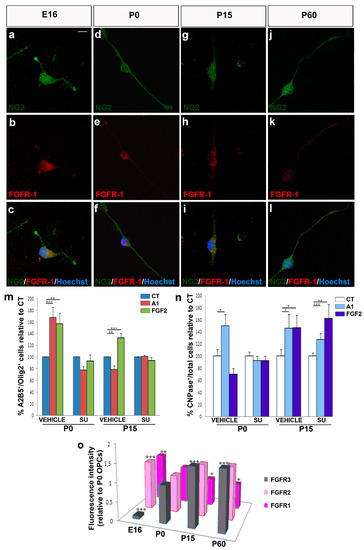 FGF2 and its receptors have been implicated in numerous processes, including cell proliferation, migration, differentiation, and survival (for reviews see: [55,56,57]). Although we previously demonstrated that FGF2 and anosmin-1 exert their effects on OPC migration via FGFR1 [12,21,29,45,46], we analyzed the expression of the three FGFRs present in the oligodendroglial lineage [58,59] in our cultures of OPCs obtained from mice of different ages (E16, P0, P15, and P60). The FGFR1 was expressed by murine OPCs at every stage analyzed (Figure 7a–l). Thus, to confirm that FGFR1 influences OPC migration, we repeated the chemotaxis assays on P0 (both anosmin-1 and FGF2 acting as chemoattractants) and P15 OPCs (anosmin-1 no effect; FGF2 chemoattractant), in the presence or absence of an FGFR-signaling inhibitor (SU5402). This inhibitor abrogated both the chemoattraction and chemorepulsion provoked by FGF2 and/or anosmin-1, confirming FGFR1 as the FGF receptor involved in P0 and P15 OPC migration (Figure 7m).