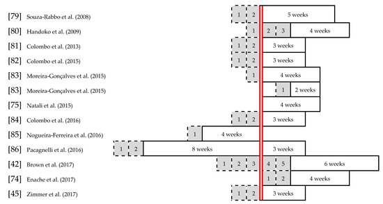 | [83] Moreira-Gonçalves et al. (2015) | RCT | 180 rats (male) MCT + early ET, MCT + late ET, MCT +S ED, early ET, late ET, sedentary | 4 weeks (early ET) or 2 weeks (late ET) | treadmill running (5/7 days; 30 m/min ↘ 25 m/min (in the last week); 60 min) |