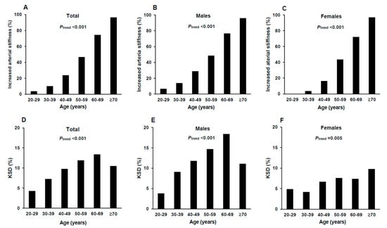 3.2. The Prevalence of Increased Arterial Stiffness and KSD by Age Group