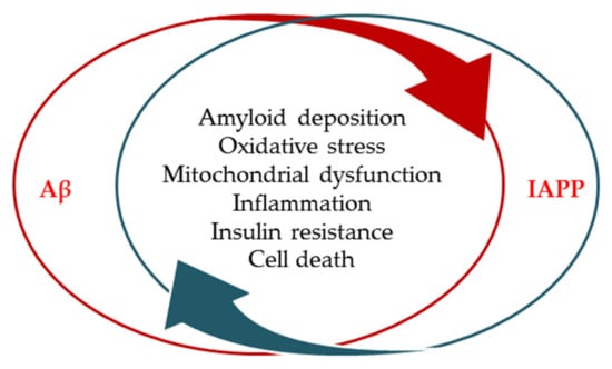 The pathological process of amyloidogenesis, in which proteins or peptides self-assemble naturally into higher order structures, called oligomers, protofibrils, and mature amyloid fibrils, occurs in several diseases, including AD and diabetes. However, data highlighting whether these various forms of amyloid proteins interact or how the formation of these amyloid structures begins are very scarce [21,22]. Amyloids gather into aggregates forming Aβ oligomers and fibrils in AD and islet amyloid polypeptide (IAPP) or amylin in diabetes. IAPP is one of the most important β-cell secretory products of the pancreatic islets of Langerhans. With putative function, IAPP is a regulatory peptide both locally in the islets, where it inhibits insulin and glucagon secretion, and at distant targets. It has binding sites in the brain, possibly contributing to the regulation of satiety and inhibition of gastric emptying, and has also been described as having effects on several other organs over time. IAPP has been identified due to its ability to aggregate in the amyloid deposits of pancreatic islets, which are seen primarily in association with type 2 diabetes in humans and diabetes in several other mammalian species, especially monkeys and cats [23]. At present, it is increasingly accepted that there are close correlations between these two diseases by overlapping their pathology, sharing common complications including impaired carbohydrate metabolism, insulin resistance, oxidative stress, inflammatory response, mitochondrial dysfunction, and amyloidosis (Figure 2) [24].