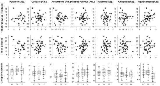 Volumes of subcortical structures adjusted for intracranial volume (ICV) and prognosis analysis (top row), cross-sectional analysis (middle row), and group comparison analysis (bottom row). TTS: total tic score; NT: NewTics; TS: Tourette syndrome; TF: Tic-free.