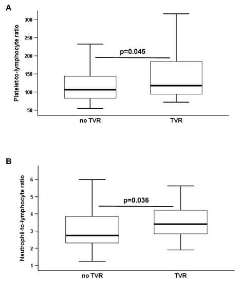 ROC curve analyses revealed that PLR and NLR could distinguish between patients without and with future TVR, with areas under the ROC curves of 0.626 and 0.632 for PLR and NLR, respectively (both p < 0.05). A PLR ≥ 91 and NLR ≥ 2.75 were identified as the best thresholds to predict TVR, providing sensitivities of 87.5% and 81.3%, and specificities of 34.9% and 50.8%, respectively, and were therefore defined as high PLR and high NLR. High PLR and high NLR were seen in 69 (72.6%) and 57 (60%) patients, respectively. TVR occurred significantly more often in patients with high PLR and high NLR than in patients with lower ratios (both p < 0.05; Figure 2).