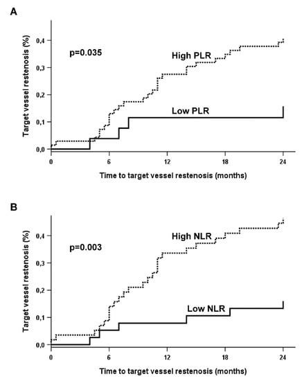 In line with our findings, Turak et al. reported an association of NLR with in-stent restenosis following percutaneous coronary intervention (PCI) with bare metal stent implantation [20]. In their study, an NLR >2.73 predicted TVR with a sensitivity of 80% and a specificity of 75%. Thereby, their cut-off was almost identical to the threshold for high NLR obtained in our study. Since all patients in both studies received bare metal stents, it remains to be established if NLR is able to predict TVR after drug eluting stent implantation. In the Ludwigshafen Risk and Cardiovascular Health (LURIC) study, NLR was independently associated with cardiovascular mortality [21]. Moreover, others found NLR to predict mortality in patients with an acute coronary syndrome [22]. Both, high PLR and high NLR were associated with a higher risk of critical limb ischemia in PAD [8,9], and with a higher risk of limb amputation [23,24]. In addition, increased PLR and NLR were linked to a poor prognosis in patients with gastrointestinal cancer [25,26]. Together with our observations, these previous reports underline the biomarker potential of PLR and NLR in various diseases.