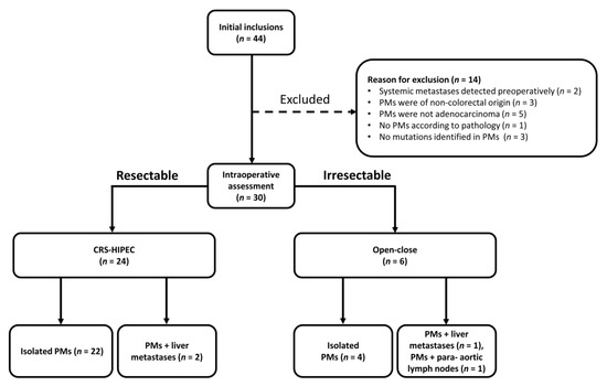 Flowchart of patient classification after initial inclusion in the study. The reasons for patient exclusion prior to intraoperative assessment are described. After the intraoperative assessment, patients either underwent Cytoreductive Surgery and Hyperthermic Intraperitoneal Chemotherapy (CRS-HIPEC) or received an open–close procedure. PMs: Peritoneal Metastases.