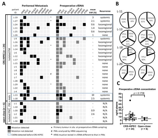 (A) An overview of the genes in which a somatic mutation was identified in peritoneal metastases (PMs) and tested for in the corresponding preoperative cfDNA sample. A black square indicates that the mutation was identified in both PMs and cfDNA; a grey square indicates a negative result for the corresponding mutations in the cfDNA. All cfDNA samples were tested using the KRAS G12/13 screening kit. (B) Comparison of the relative proportion of mutations detected in PMs and preoperative cfDNA samples. (C) Concentration of cfDNA samples. A black dot denotes that ctDNA was detected; lines indicate the median and the interquartile range. HRM-sequencing: High-Resolution Melting assay followed by Sanger sequencing.