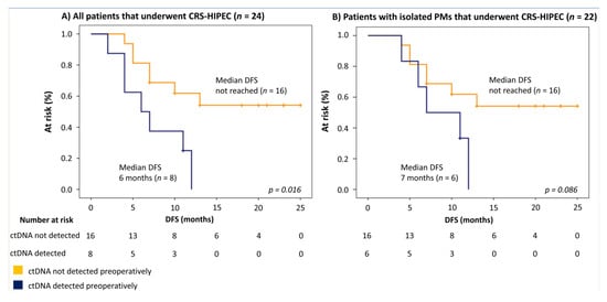 The association between preoperative ctDNA detection and recurrence was tested in 14/24 patients who were diagnosed with a recurrence during the follow-up period (median DFS 17 months, range 6–25). The proportion of these patients who had detectable ctDNA preoperatively was higher for those with a systemic- (4/5, 80%) compared to a loco-regional recurrence (3/9, 33%). Regardless of the type of recurrence, preoperative ctDNA detection was associated with a median DFS of 6.0 months (95%-CI 1.8–10.2), significantly worse compared to patients without ctDNA detection (median DFS not reached, p = 0.016; HR 3.454, 95% CI 1.145–10.423) (Figure 3A). When the two patients with resectable liver metastases were excluded from the survival analysis, both of whom had detectable ctDNA, a trend was still observed, but the difference was no longer significant (median DFS 7.0 months vs median DFS not reached, p = 0.086; HR 2.673, 95% CI 0.806–8.857) (Figure 3B). A univariate analysis was performed to test the association between other clinically relevant clinico-pathological variables and DFS after CRS-HIPEC. A PCI higher than 10 (5.0 months versus median DFS not reached, p = 0.035) and the presence of liver metastases (2.0 months versus 12.0 months, p < 0.001) were found to have a significant association (Table S3).