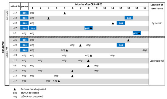 Tissue-guided ctDNA analysis of plasma samples taken from 14/24 patients during follow-up after CRS-HIPEC. Ten patients did not provide a sample. Patients are categorized by the location of metastases before or during CRS-HIPEC and the location of recurrence(s) during follow-up. The blue color is to highlight a positive result.