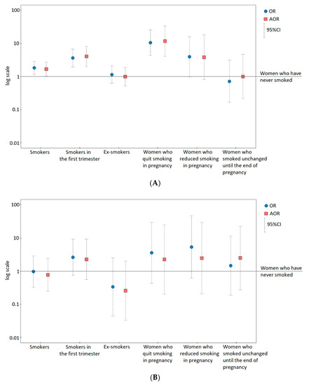 Odds ratios (and 95% confidence intervals) of gestational hypertension (A) and pre-eclampsia (B) for smoking categories on a logarithmic scale. The adjusted odds ratios (AOR) were calculated after adjusting for maternal age, primiparous women, pre-pregnancy body–mass index (BMI), and gestational weight gain outside the range of the recommendations regardless of the BMI category.
