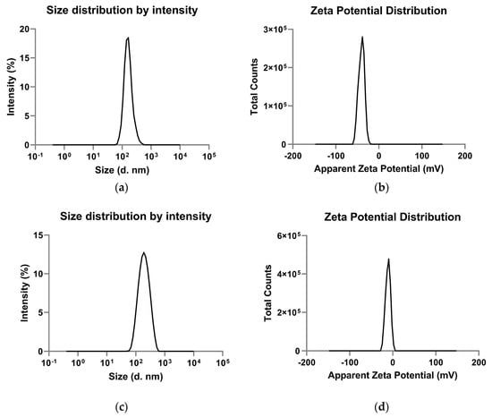 Particle size distribution and zeta measurement profile of native (a,b) and vascular endothelial growth factor-conjugated poly-lactic-co-glycolic acid nanoparticles (VEGF-PLGA-NPs) (c,d). Data are three different measurements made by the instrument on the same sample. (a) Size distribution of PLGA-NPs; (b) zeta potential distribution of PLGA-NPs; (c) size distribution of VEGF-PLGA-NPs; (d) zeta potential distribution of VEGF-PLGA-NPs.