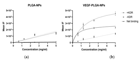 2.4. In Vitro Binding of VEGF-PLGA-NPs and PLGA-NPs to KDR-Fc