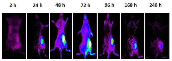 In vivo pharmacokinetic studies of PLGA-NPs showed maximum tumor uptake at 72 h p.i., as shown in Figure 4. This result was confirmed by ex vivo imaging of the collected organs and a semi-quantitative analysis of the ROIs (Figure 5, Table 2). After PLGA-NPs injection, the tumor was clearly visible in planar whole body images, with a signal that increased up to 24 h with a high contrast to noise ratio. Tumor accumulation of PLGA-NPs gradually decreased with time over 240 h p.i.