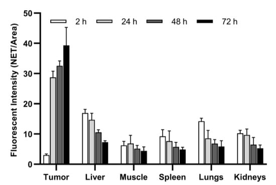Biodistribution of PLGA-NPs in BALB/c mice. Data are expressed as average fluorescence (NET/Area) ± SD of five different mice per time point.