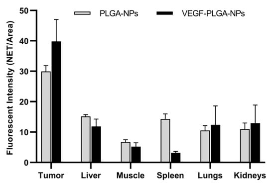 Comparative distribution of PLGA-NPs and VEGF-PLGA-NPs at 24 h post-injection (p.i.) in collected organs. Data are expressed as average fluorescence (NET/Area) ± SD of five different mice per group.