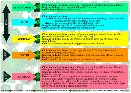 Several risk factors are associated with the complications of COVID-19, and these include older age (>65), chronic respiratory diseases, cardiovascular diseases, hypertension, diabetes, and obesity. Acute respiratory distress syndrome (ARDS) is reported to be the most common complication [,]. Other severe or fatal complications include pneumonia, type I respiratory failure, sepsis, metabolic acidosis, septic shock, arrhythmia, acute cardiac injury, heart failure, acute kidney injury, bleeding, or hypoxic encephalopathy [,,,]. So far, males are registered to be infected with a higher prevalence compared to females and the reason is yet undiscovered [,]. COVID-19 lasts approximately 6 weeks and the duration, as well as the severity of the disease, depends primarily on the age and the immune system of an infected individual. Clinical manifestations can range from being mild to severe and patients can present as either symptomatic or asymptomatic, but a majority of COVID-19 cases are symptomatic with a moderate case-fatality rate (Figure 1) [,].