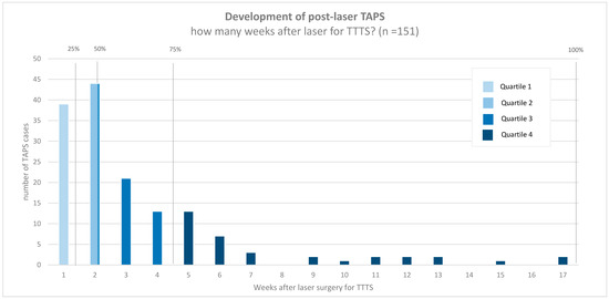 TAPS was diagnosed antenatally in 92% (151/164) and only postnatally in 8% (13/164) of the group (Table 1). Laser for TTTS (prior to post-laser TAPS) was performed using the Solomon technique in 37% (60/164) and the selective technique in 63% (104/164). The operating surgeon assumed that the laser for TTTS was complete in 81% (126/156) of post-laser TAPS cases, in 74% (43/58) of cases treated with the Solomon technique, and in 85% (83/98) of cases treated with the selective technique. Reasons for incomplete laser were: poor visibility (n = 11), fetal position (n = 7), placental position (n = 5), bleeding (n = 2), velamentous anastomoses (n = 1), vomiting of patient (n = 1), and not specified (n = 3). In half of the antenatally detected TAPS cases, TAPS developed within 14 days (IQR: 7–28; range 1–119) after laser treatment for TTTS. Figure 1 depicts time between laser for TTTS and the diagnosis of post-laser TAPS for all antenatally diagnosed cases. In 45% (73/161) of cases, TTTS donors became TAPS donors. Antenatal management included expectant management in 43% (62/151), IUT (± PET) in 29% (44/151), laser reintervention in 15% (24/151), selective feticide in 7% (11/151), delivery in 6% (9/151), and TOP in 1% (1/151) (Table 2).