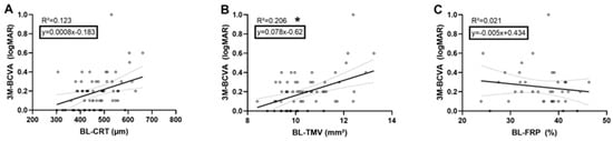 Linear regression model showing the 3-months (3M) best corrected visual acuity (BCVA) dependency of each central retinal thickness (CRT) (A), total macular volume (TMV) (B), and full retinal perfusion (FRP) (C) at baseline (BL). Black line represents the linear regression line; dotted line shows the upper and lower bound of the 95% confidence interval. * signifies p < 0.05.
