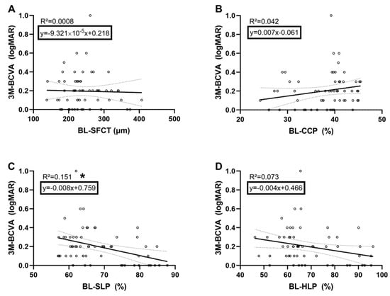 Linear regression model showing the 3-months (3M) BCVA dependency of each SFCT (A), CCP (B), SLP (C), and HLP (D) at baseline (BL). Black line represents the linear regression line; dotted line shows the upper and lower bound of the 95% confidence interval. * signifies p < 0.05.