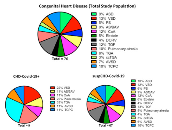 A total of eight high-volume CHD centres (Bergamo Hospital; Ancona Hospital; Policlinico San Donato of Milan; University of Padua; Bambino Gesù Children’s Hospital of Rome; Bambino Gesù Pediatric Hospital of Taormina; University of Messina; Monaldi Hospital of Naples, Italy) participated in data collection. Overall, 76 COVID-19-infected CHD cases were registered from 21 February to 4 April 2020 and were reported in this study, including four children (less 18 years old) and 72 adults. The distributions of the CHDs reported are listed in Figure 1.